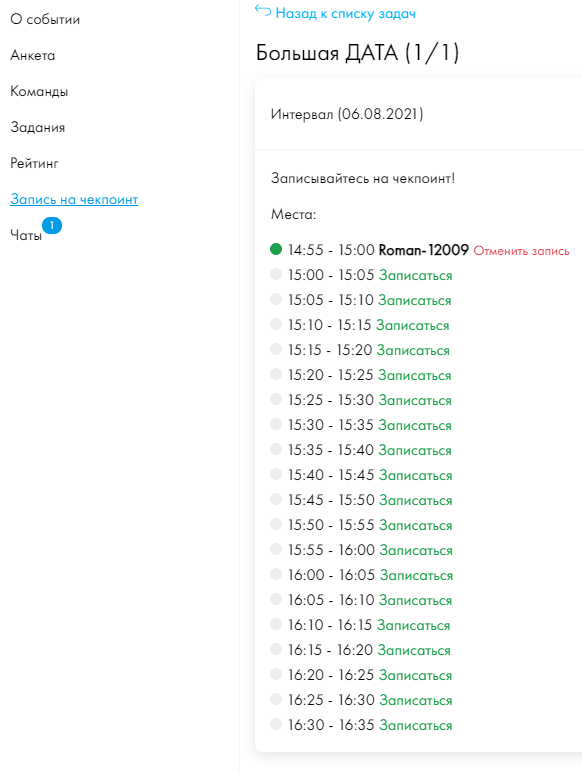 Если к заданию прикреплен интервал, то участник или команда может нажать на кнопку "Записаться на чекпоинт" и выбрать любой свободный интервал для встречи. После выбора интервала, участнику придет письмо с оповещением о том, что интервал закреплен за ним.